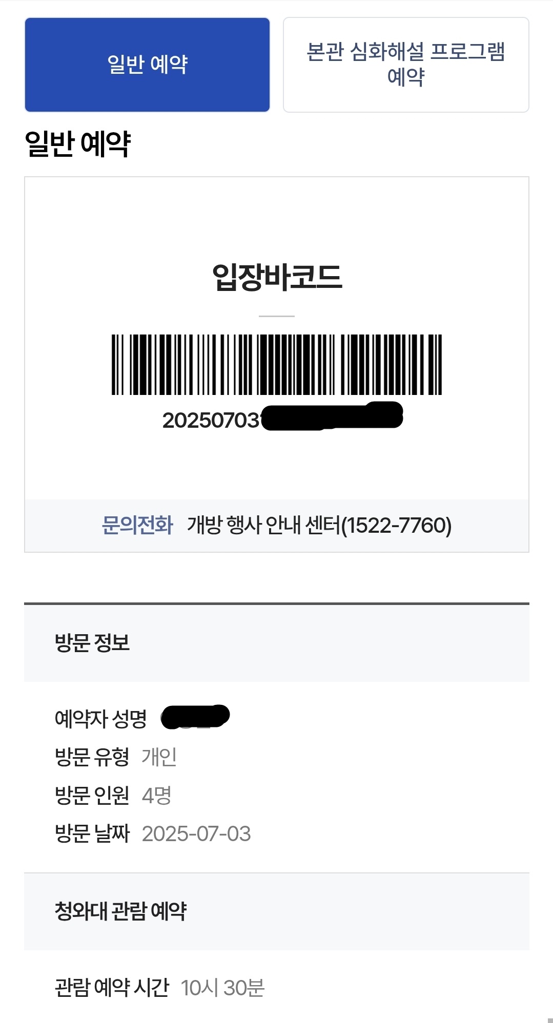 - 예약 시 입력했던 이름, 연락처, 비밀번호 필요